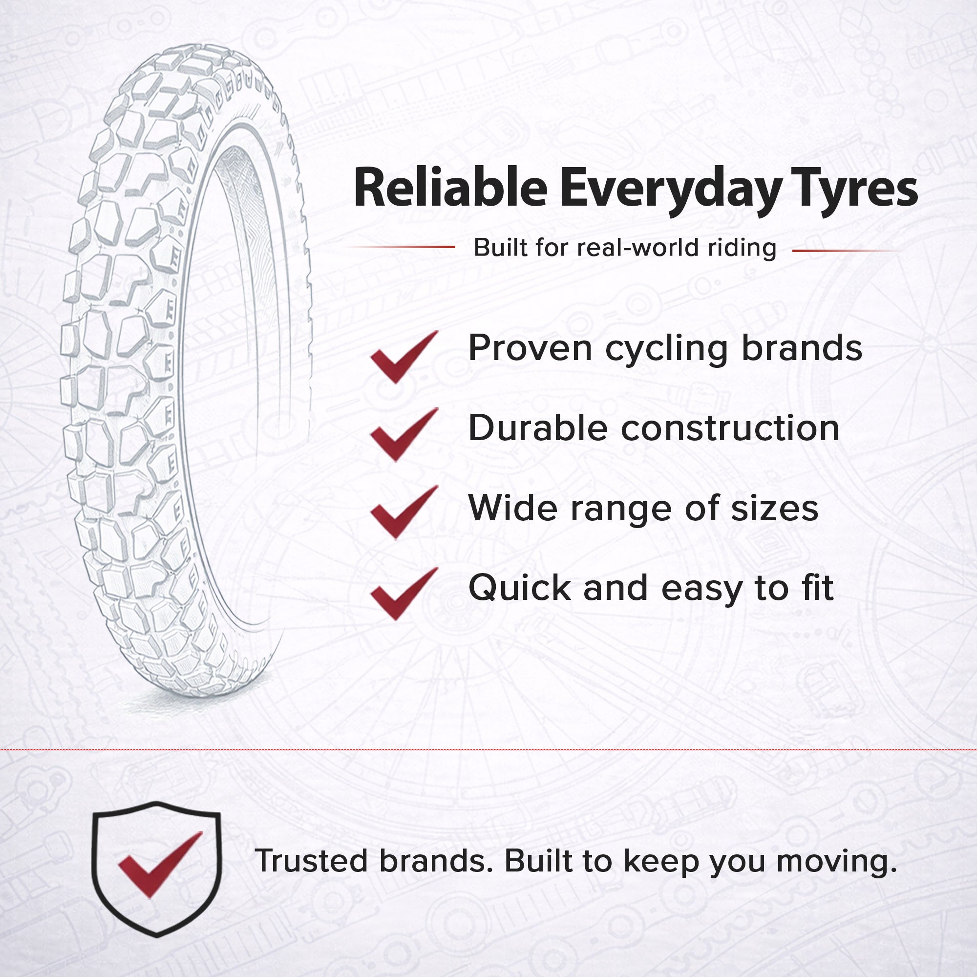 The smooth tread pattern offers lower rolling resistance compared to knobbly tyres, making it ideal for urban use and regular walking surfaces.